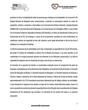 Ante ello, exigieron a las autoridades del Estado Mexicano que les garanticen la seguridad, integridad y la vida de las más de 150 familias de personas desaparecidas que participan en la VII Brigada Nacional de Búsqueda y de las familias que arriesgan su vida con el único propósito de encontrar a sus seres queridos.