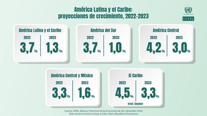 La organización prevé que el próximo año el Producto Interno Bruto (PIB) de la región aumente 1,3 % de manera interanual, tres veces menos que el 3,7 % previsto para 2022. La mayor contracción se registraría en las naciones sudamericanas cuyo crecimiento proyectado es solo del 1 % para 2023. Mientras que la región de México y Centroamérica, así como la del Caribe experimentarían incrementos del 1,6% y 3,3%, respectivamente.