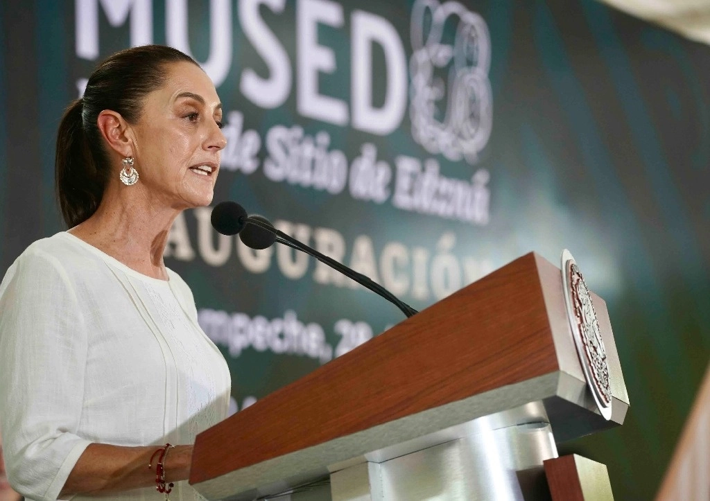 Sheinbaum le ofreció: “Presidente, tenga la certeza que la vamos a cuidar y engrandecer”, expresó entre aplausos durante la inauguración del Museo de Sitio de la zona arqueológica de Edzná”.