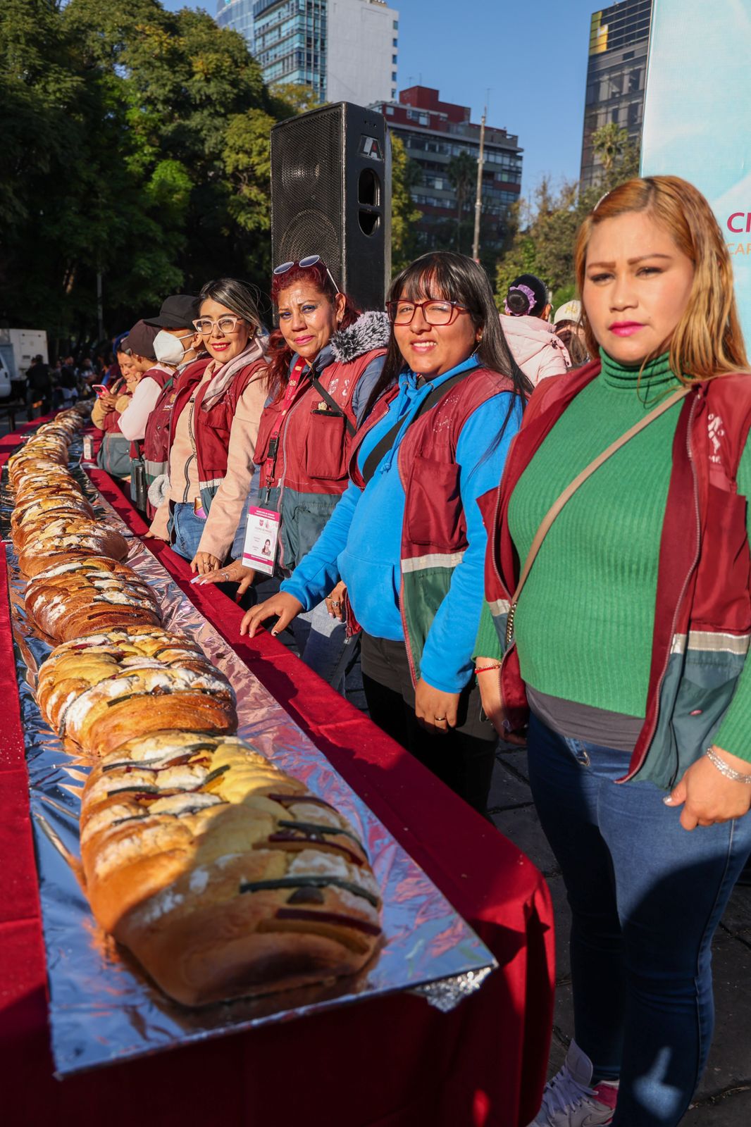 Por primera vez el Ángel de la Independencia fue escenario del reparto del roscón, de 400 metros lineales y más de mil 800 kilos, que fue distribuida en 600 pedazos de tres kilos cada uno y alcanzaron para cerca de 28 mil capitalinos, quienes hicieron fila desde dos horas antes, en una tradición que ya cumple 27 años. Acompañada de integrantes de su gabinete, la jefa de Gobierno, Clara Brugada, entregó juguetes y porciones de pan.